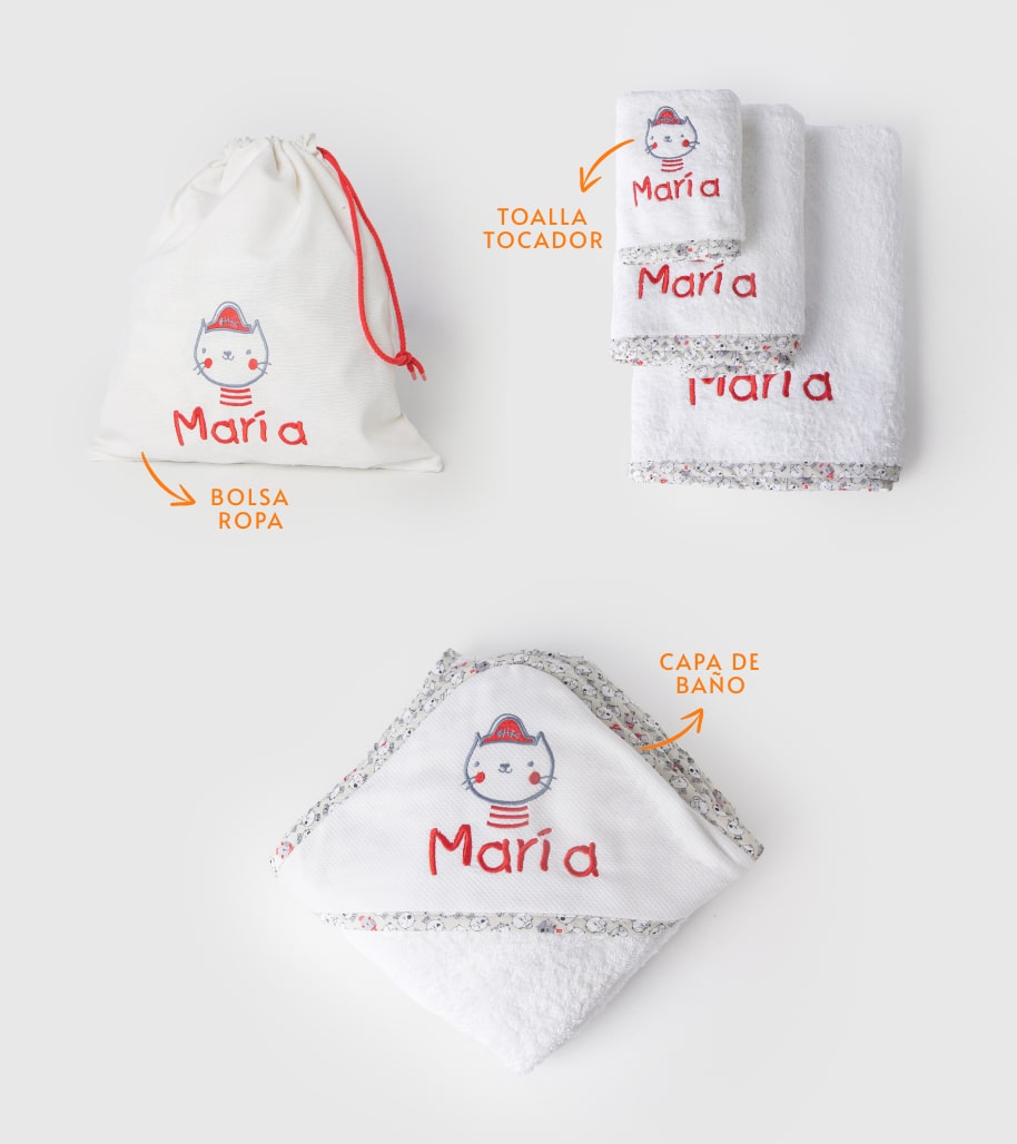 Babero de aproximadamente 25*25 confeccionado en pique de tergal y bordado con el nombre del niño/a y dibujo, canteado con bies de tergal con dibujo a juego y forrado por dentro con rizo de algodón 100%.
