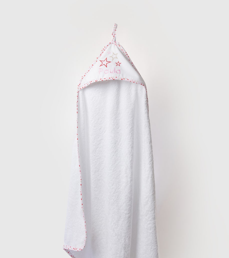 Capita de rizo americano de 480gr y 100% algodón, de 1 por 1, con capucha de pique bordada con el nombre del bebe y dibujo elegido de 50alg/50poliester forrada de rizo y canteada con bies de tergal decorado a juego con el bordado. Todo el artículo en contacto con la piel del bebe es de algodón 100.