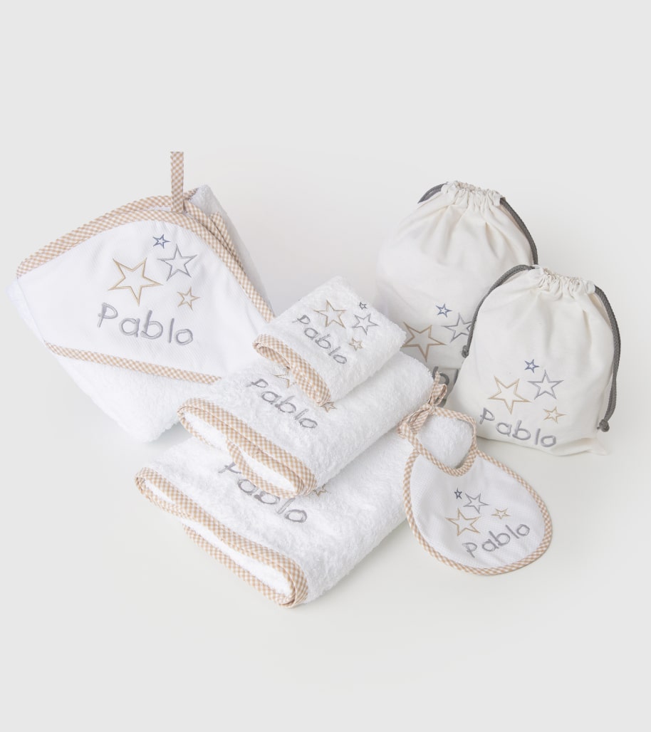 Este mini pack es la combinación perfecta de estilo y funcionalidad en tamaño compacto. Incluye una suave capa de baño y un práctico babero, diseñados para mantener a tu bebé cómodo y limpio en todo momento. Personaliza todas las piezas con el mismo diseño y el nombre de tu bebé.