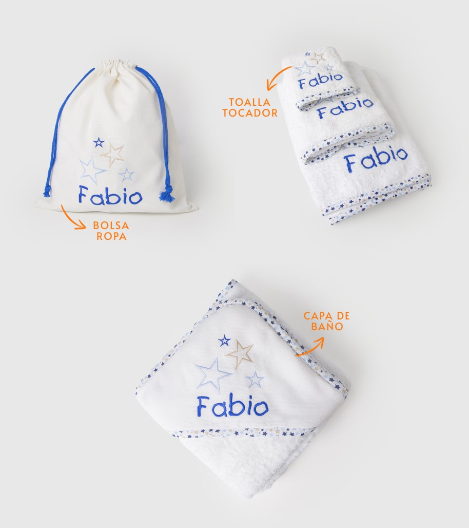 La solución perfecta para las aventuras de tu pequeño/a. Este práctico pack viajero está diseñado pensando en la comodidad durante tus desplazamientos. Incluye capa de baño, toalla tocador y bolsa de ropa. Personaliza todas las piezas con el mismo diseño y el nombre de tu bebé.