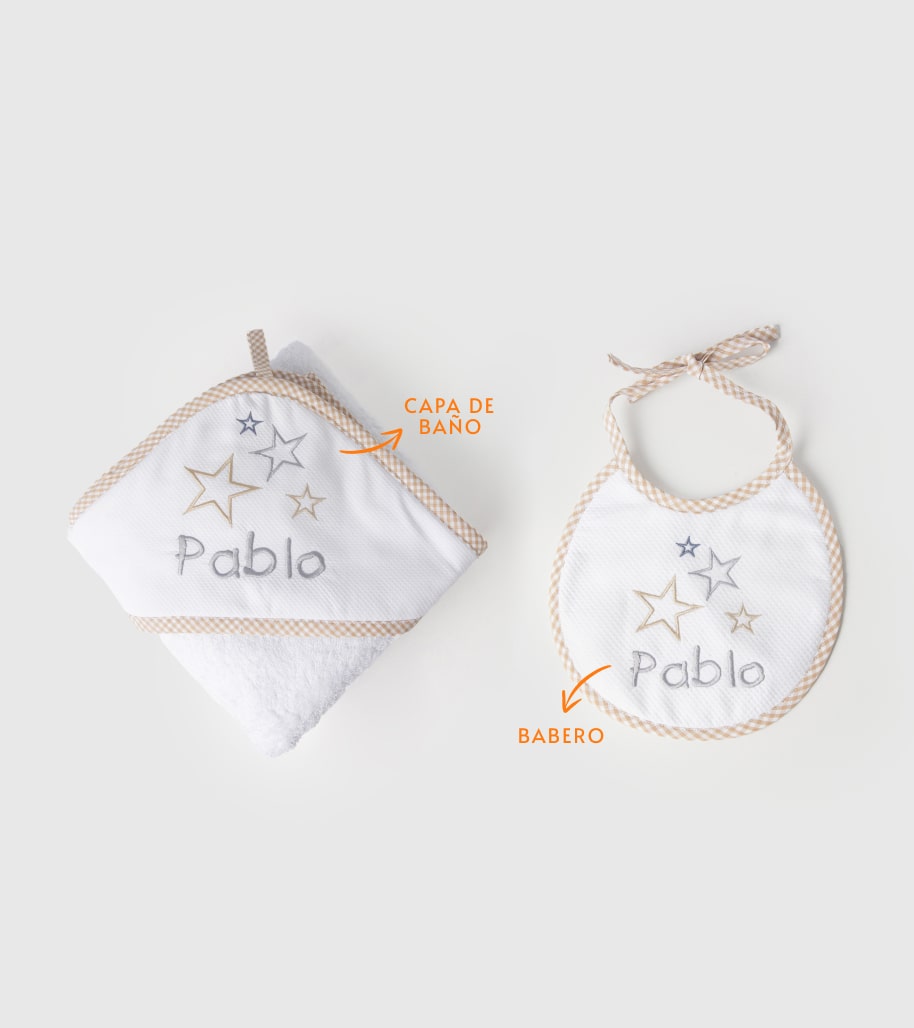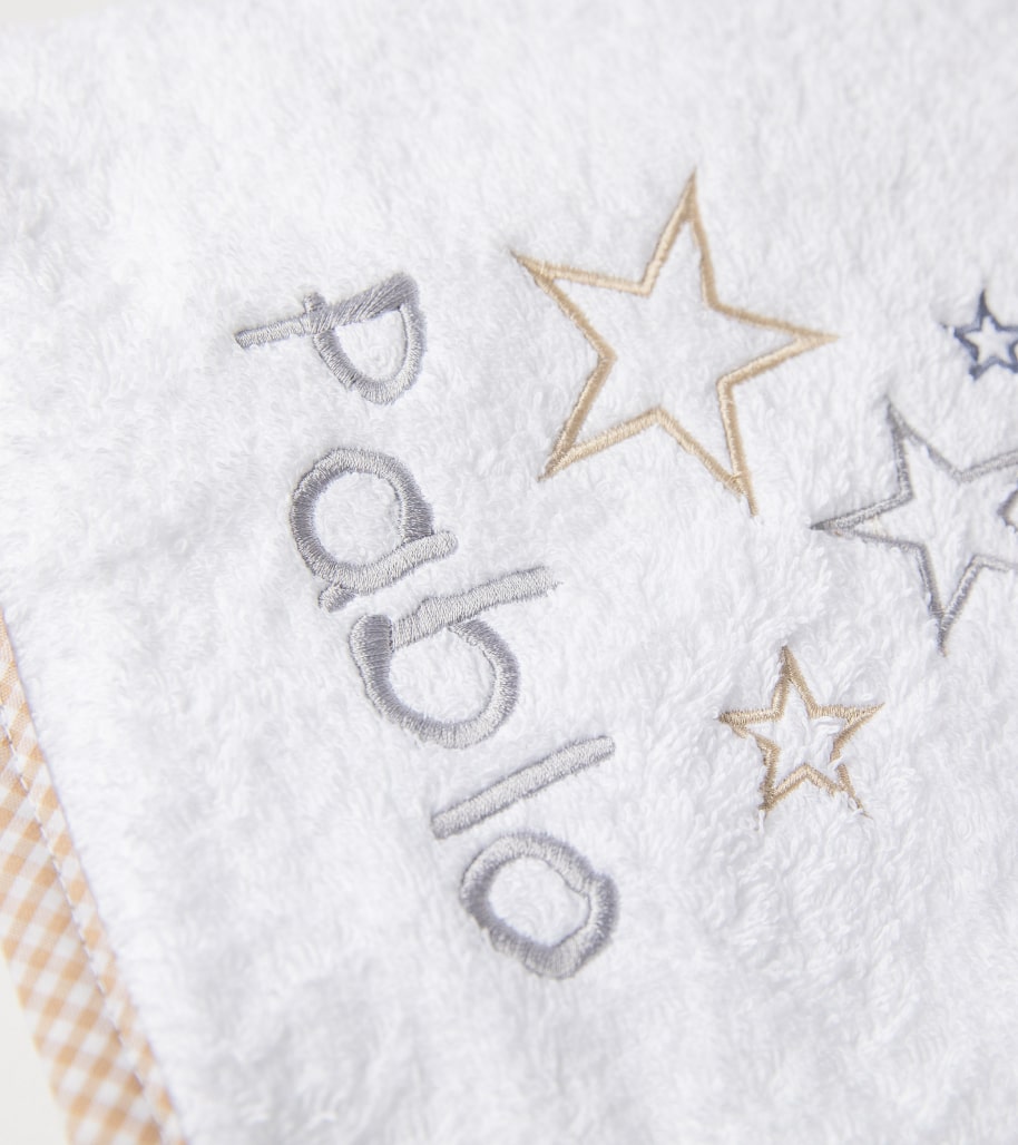 Toalla de rizo americano de 480gr y algodón 100% bordada y canteada con bies de tergal decorado a juego con el bordado y también personalizada. Todo el artículo en contacto con la piel del bebe es de algodón 100.