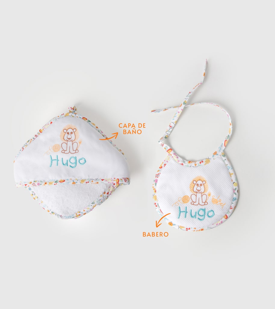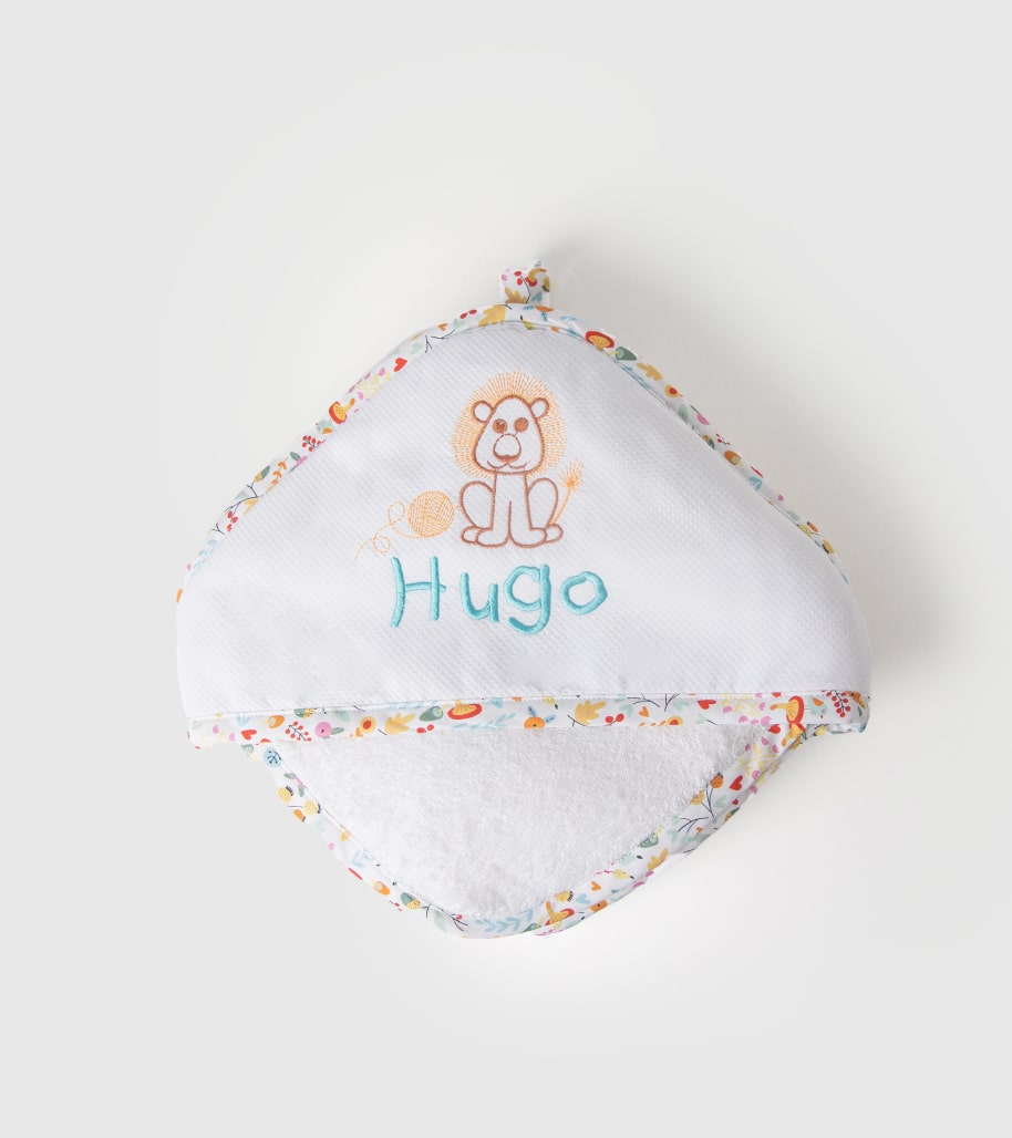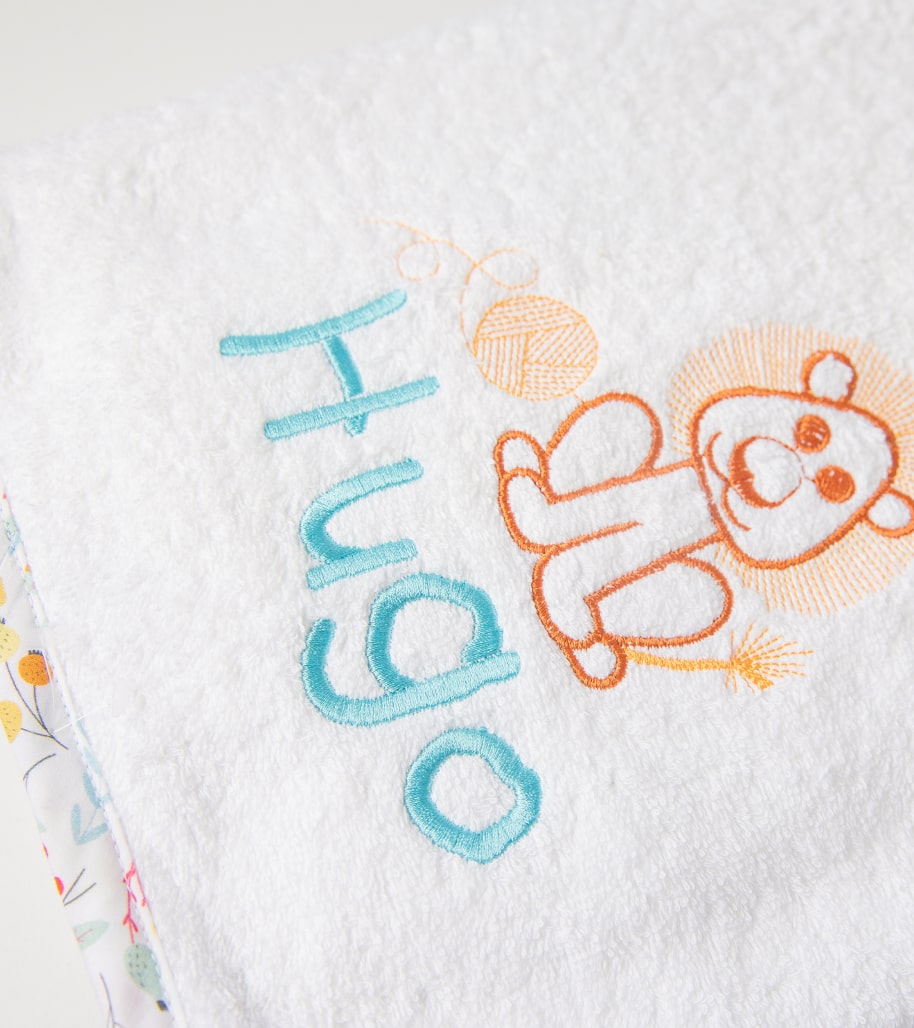 Toalla de rizo americano de 480gr y algodón 100% bordada y canteada con bies de tergal decorado a juego con el bordado y también personalizada. Todo el artículo en contacto con la piel del bebe es de algodón 100.