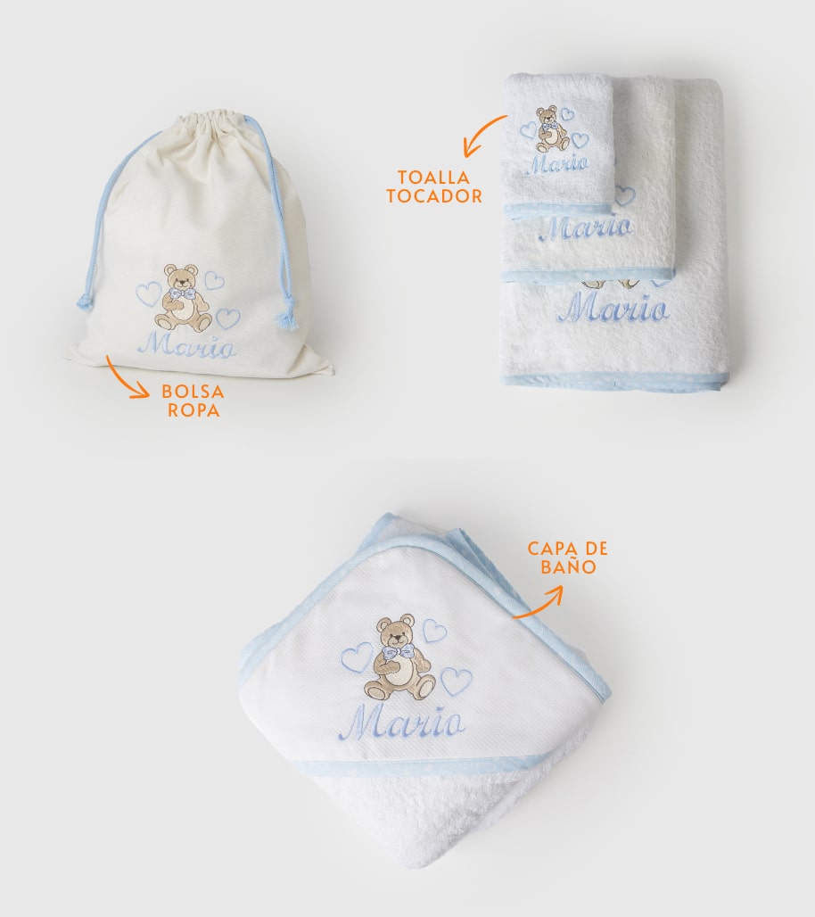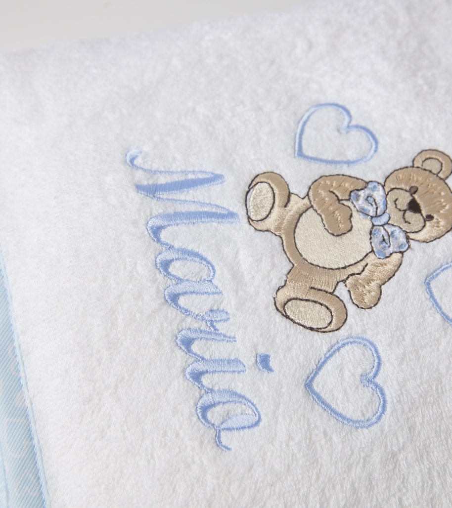 Toalla de rizo americano de 480gr y algodón 100% bordada y canteada con bies de tergal decorado a juego con el bordado y también personalizada. Todo el artículo en contacto con la piel del bebe es de algodón 100.